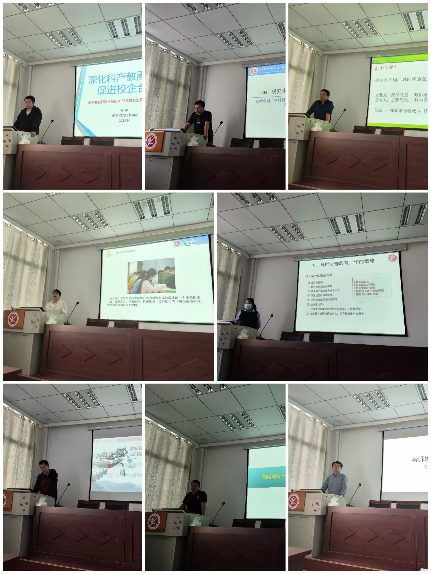 ’研究生创新能力培养改革与实践”、“做好新时代立德树人的奋斗者”、“如何成为一名合格的研究生导师”、“构建和谐导学关系”、“创新型人才培养模式思考”、“深化科产教融合、促进校企合作”、“育人之道”主题分享和交流。