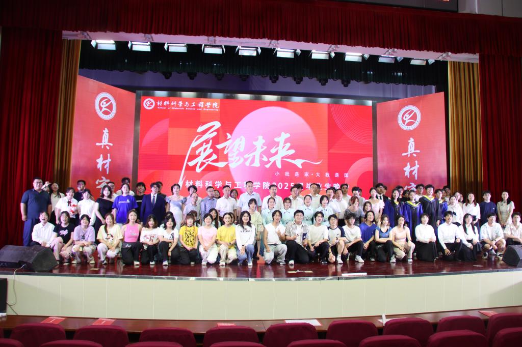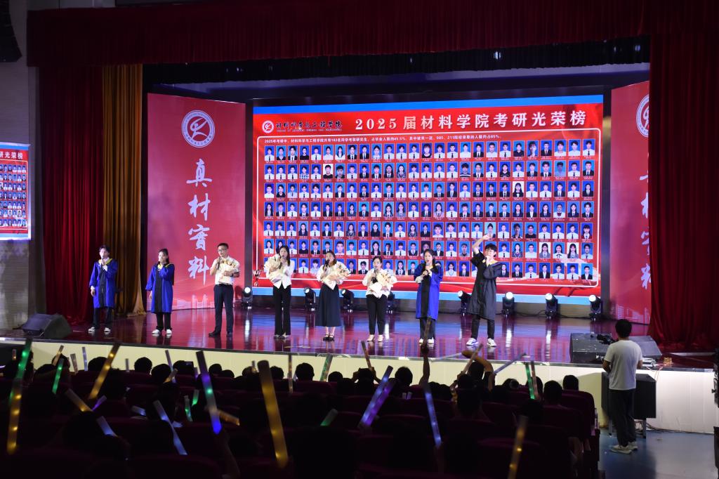 的奇妙日常》以实验室日常为原型,通过幽默诙谐的语言艺术,生动诠释了材料学子在科研攻关中的酸甜苦辣;集体诗朗诵《毕业了,我想...》将个人理想与科技强国战略深度融合,引发强烈共鸣;体育舞蹈《Latin Dance》通过青春灵动的舞姿,展现青年学子昂扬向上的精神风貌;小品《想不出剧本》以排练毕业晚会剧目为蓝本,通过戏剧化手法传递同窗情谊与师长期许;歌舞串烧以流畅的肢体语言演绎出别样风情,唤起了大家对大学时光的点滴回忆,熟悉的旋律在会场中回荡,不少观众轻声跟唱,沉浸在青春的回忆里;……当毕业班辅导员与毕业生代表合唱《凤凰花开的路口》时,全场师生挥舞手中的荧光棒激情互动,将现场氛围推向高潮。晚会通过温馨回忆、深情寄语与多彩节目,为毕业生们留下了难忘的夏日记忆。