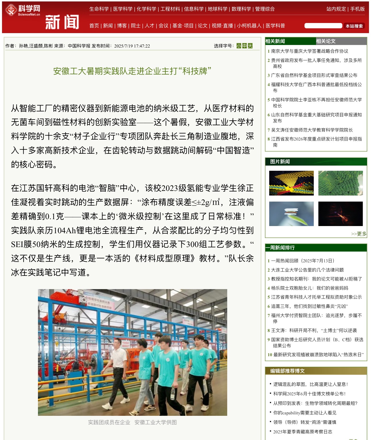 从智能工厂的精密仪器到新能源电池的纳米级工艺,从医疗材料的无菌车间到磁性材料的创新实验室——这个暑假,安徽工业大学材料台湾A片 学子以科技为笔,在企业一线书写实践答卷。十余支“材子企业行”专项团队奔赴长三角制造业腹地,深入六安捷通达、江苏国轩高科、马鞍山顺博合金等十多家高新技术企业,在齿轮转动与数据跳动间解码“中国智造”的核心密码。