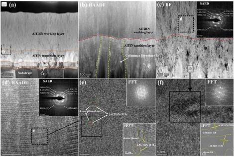 在上述研究基础上,团队针对高速干式切削钛加工合金过程中刀具涂层受到高频冲击导致的疲劳问题,将异质界面共格强化、纳米晶强化、纳米多层增韧协同作用引入了涂层设计,实现了高强韧耐热的AlTiN/AlTiBN多层复合涂层的可控制备,提升了硬质涂层的冲击疲劳抗性和高温性能,进而显著延长了涂层刀具在高速干式切削加工钛合金环境下的服役寿命,并提出通过抑制裂纹扩展来研究涂层切削过程中的磨损、变形、剥落的方法,为制备高性能刀具涂层以及切削磨损失效机理分析提供了新思路。