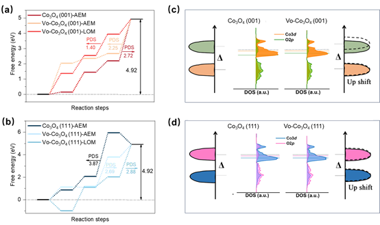 材料的原子排布各向异性导致材料的电导率、极化率、电学性质等各向异性,使得不同暴露晶面的原子结构、能级结构和表面能等存在差异。这些差异对于催化剂活性位点的电子结构和本征催化活性有着重要的影响。目前,研究发现尖晶石Co3O4的OER活性对其暴露晶面具有依赖性。除了原子排布之外,氧空位的引入可有效改善Co3O4的电子结构和OER活性。因此,探究在Co3O4不同晶面上引入氧空位对其OER活性及催化机理的影响,对开发高性能钴基电催化剂具有重要意义。