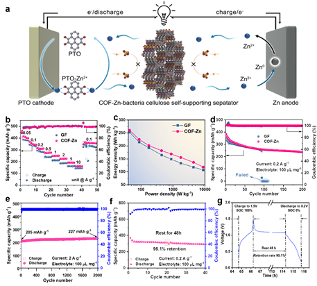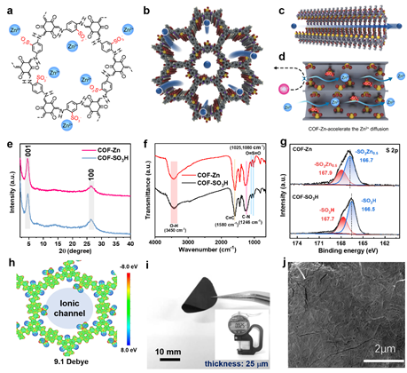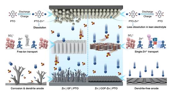 团队设计了一种具有准单离子导电性的共价有机框架(COF)的隔膜,即采用锌离子取代的磺酸盐COF(COF-Zn)膜,旨在解决这些挑战。该COF-Zn隔膜具有较高的锌离子迁移数(0.87)和薄至25 mm的厚度,能够减少电解液的使用量(20 μL mg-1),同时有效减少阴极溶解。这种准单离子导电性和负电性特性通过降低水活性,同时改善了锌负极的稳定性。