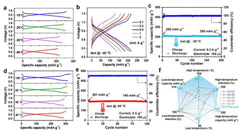 采用该隔膜实现了超稳定的AZIBs,研究验证了包括Zn//4,5,9,10-芘四酮(PTO)、Zn//I2和Zn//V2O5在内的各种全电池的性能。特别是Zn//PTO电池在贫电解液的条件下达到了260 Wh kg-1的能量密度,100%的容量保持率,并且采用定制电解液能够在-40°C至+100°C的全气候条件下稳定循环。研究成果为超稳定、宽温域稳定运行的水系锌离子电池设计提供了新的解决方案。(撰稿:徐杰 顾京宇 审核:赵何腹 李永涛)