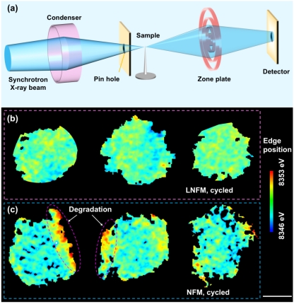 这种改性后的正极材料在高工作电压下展现出卓越的快速充电能力(5C时为121.6 mAh/g,仅需12 min即可充到额定容量的百分之八十),并且使用寿命得到极大地提高(1000次循环后仍保持76%初始容量)。此外,研究者通过同步辐射级TXM-XANES连用技术,表征并证实了通过改善材料的颗粒致密结构和降低充放电过程中的晶格应力可以减少副反应并保持高电化学活性,最终实现了快速充电、长寿命和高电压的钠离子电池。