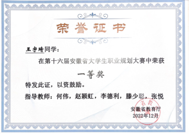 第十六届安徽省大学生职业规划大赛一等奖(王宇琦) |