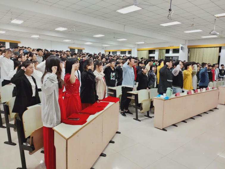 此次仪式由全体新生团员起立合唱团歌拉开序幕。在薛二巧的带领下,在场的20级新生团员全体起立,举起右拳,庄严宣誓。宣誓过后,滕少聪为新生团员代表颁发三证,并对他们提出了新的要求。在新老团员代表上台讲话后,新生团员通过观看团史了解学习了共青团的精神与文化。
