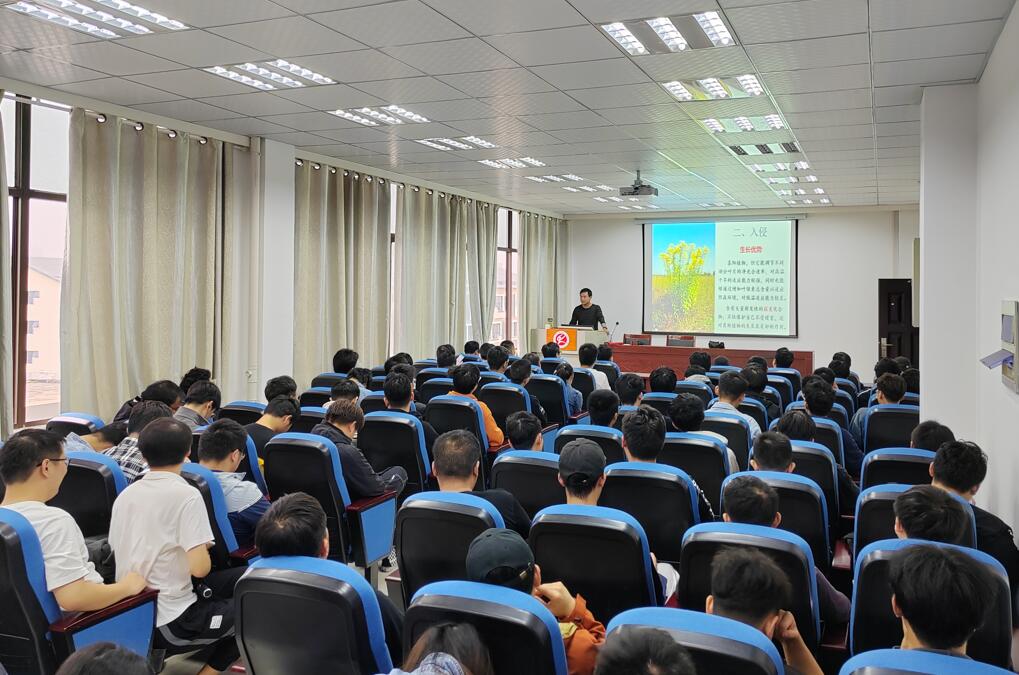 师生代表讲授《“加拿大一枝黄花”防治及生态文明保护知识》的专题讲座。江浩科普了“加拿大一枝黄花”的分布区域、发生面积、发生趋势、传播扩散途径、危害影响方式以及清除方法等知识,他结合习近平生态文明思想,从绿色发展战略、发展路径、发展目标等三方面诠释了开展生态文明建设的重要意义与举措。他鼓励同学们要积极成为社会主义生态文明建设的践行者,共同建设美丽校园、美丽中国。讲座案例丰富、引经据典、生动形象,在场师生深受启发,受益匪浅。