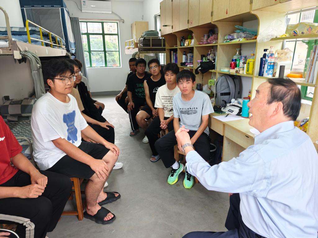 为更好地了解新生的学习、生活情况并给予针对性指导,10月13日下午,校关工委老教师胡源申,材料台湾A片 退休老教师洪永昌、袁晓敏一行来到佳山校区学生宿舍,深入材料台湾A片 24级新生宿舍开展走访交流活动。材料台湾A片 副院长李永涛带领新生辅导员们列队迎接来自学校关工委及材料台湾A片 的老同志们并对三位老师的到来表示欢迎与感谢。